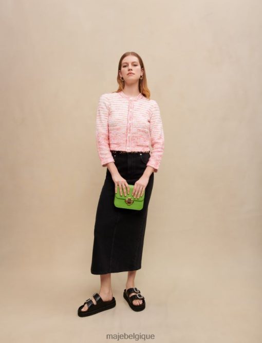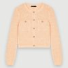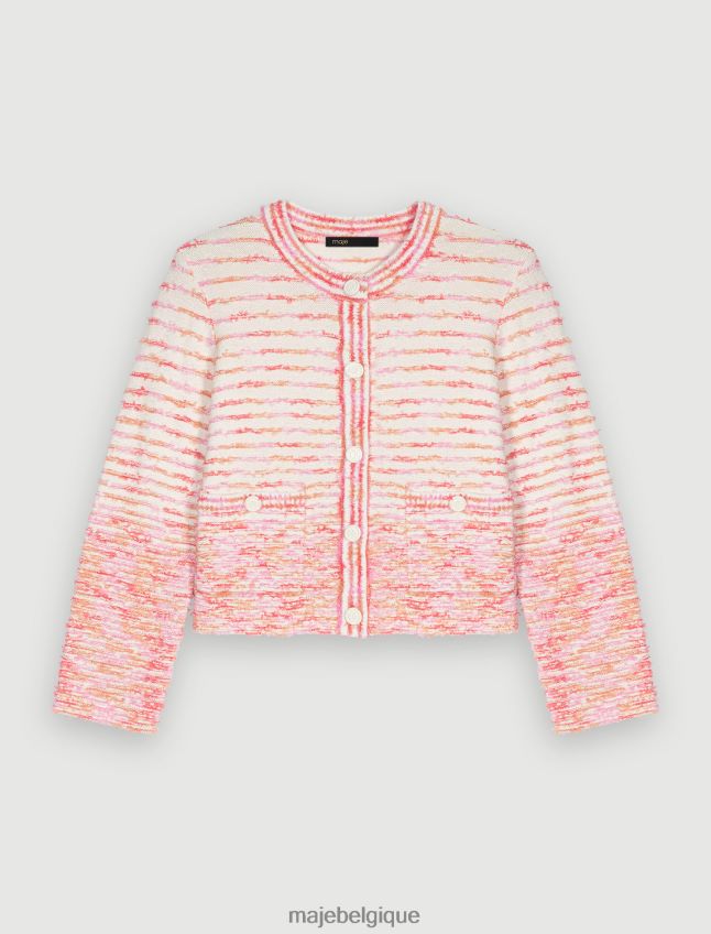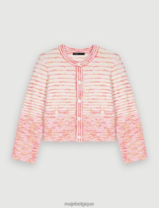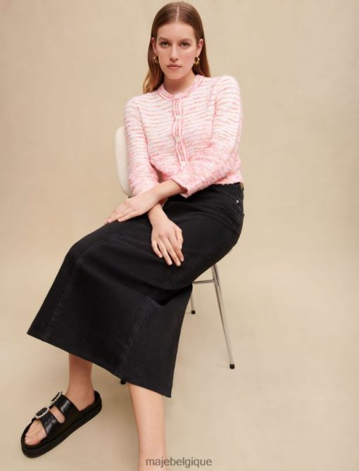 doux mais structuré, ce cardigan en maille à col rond et manches longues présente des rayures contrastées en fils coupés. il se ferme avec des boutons pression. le modèle idéal pour réchauffer vos looks maje de mi-saison.