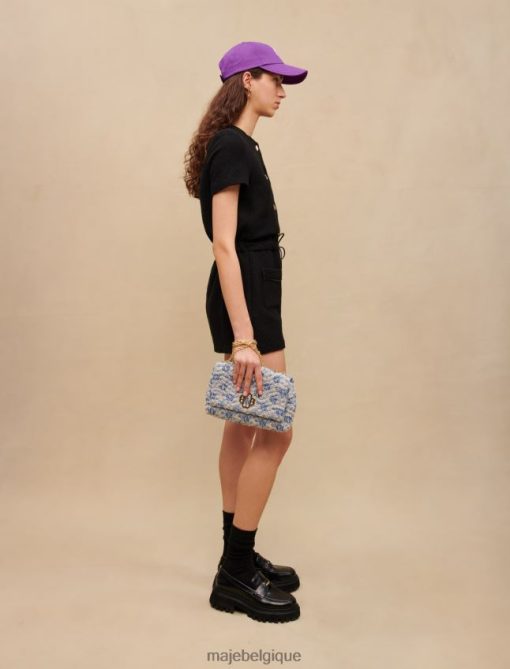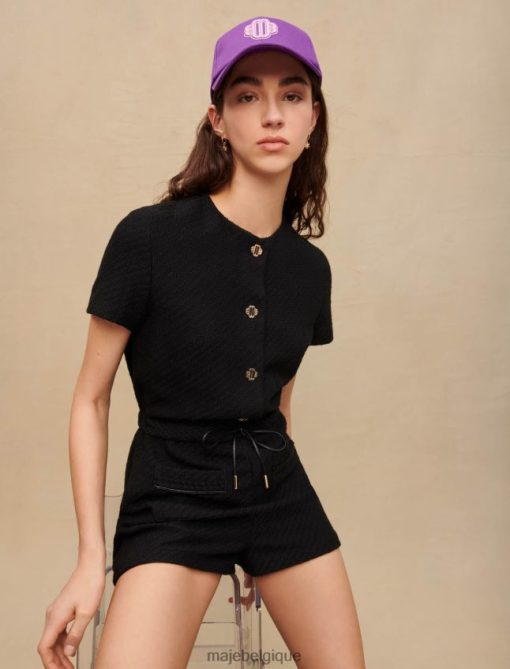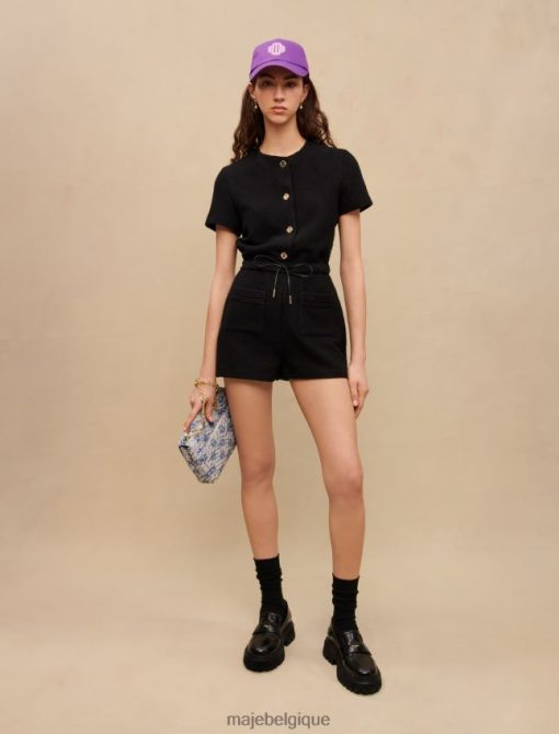Combishort coupe droite resserré par un lien à la taille. tweed noir décoratif. manches courtes et droites. fermeture éclair latérale. Boutons-pression trèfle Maje en métal doré sur le devant. garniture tressée noire. lien à la taille en simili cuir avec finitions métalliques. poches plaquées sur le devant. parfait pour une journée au bureau ou une soirée.