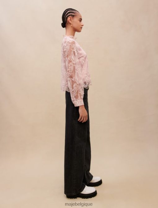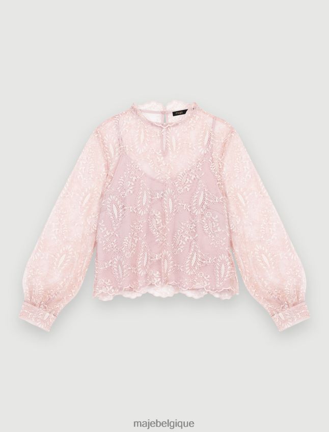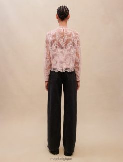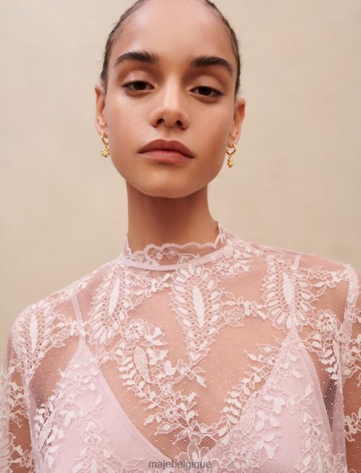 ce top en dentelle rose respire la féminité. il présente une doublure amovible rose poudré et est agrémenté d’un haut entièrement réalisé en délicate dentelle rose. c’est un style à manches longues et col rond.
