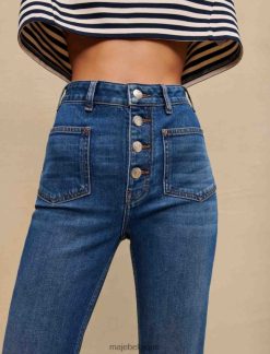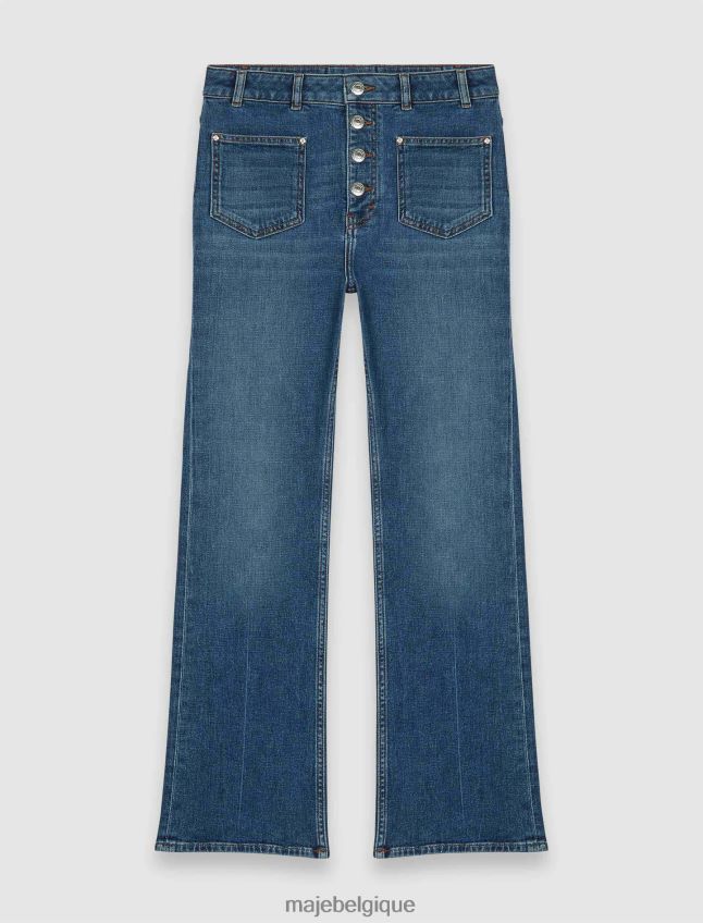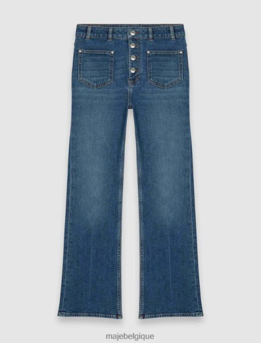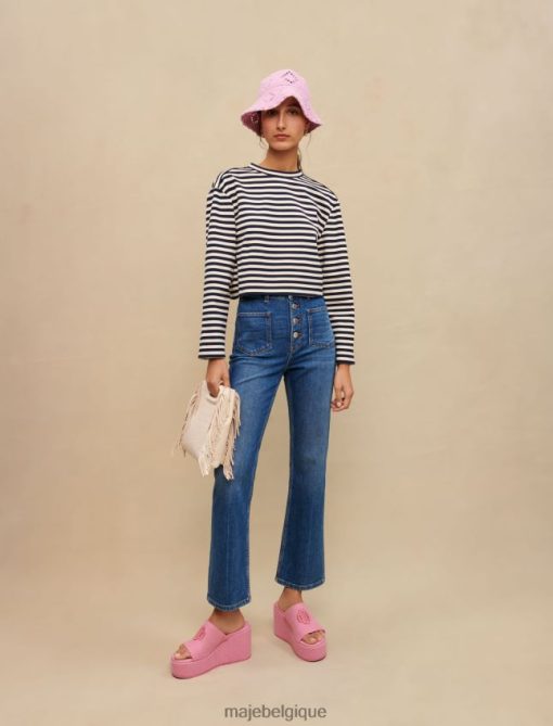 Jean coupe droite, légèrement évasé dans le bas. tissu denim légèrement délavé, effiloché en bas. poches arrière et poches plaquées devant avec rivets métalliques trèfle majesté. boutons métalliques visibles devant avec logo maje. étiquette trèfle maje. peut être porté avec les t-shirts de cette saison.