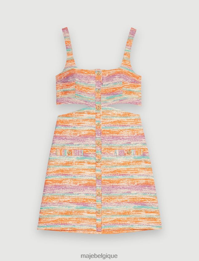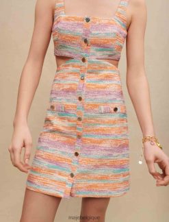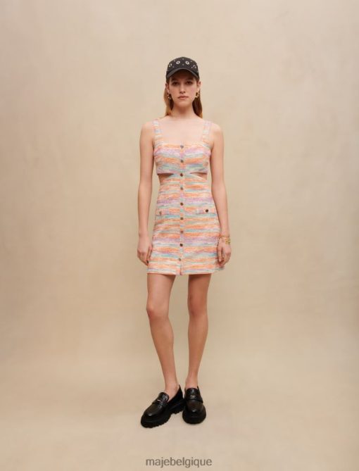cette mini-robe en tweed aux couleurs pastel présente des découpes sur les côtés pour un look structuré mais audacieux. il propose de larges bretelles, des poches avant, un devant boutonné et un dos élastiqué.