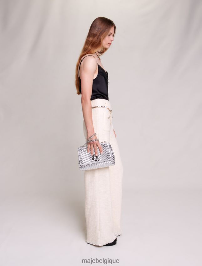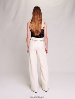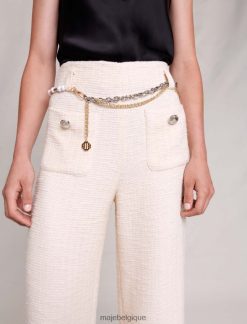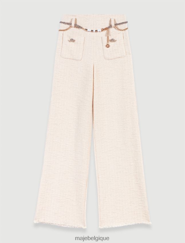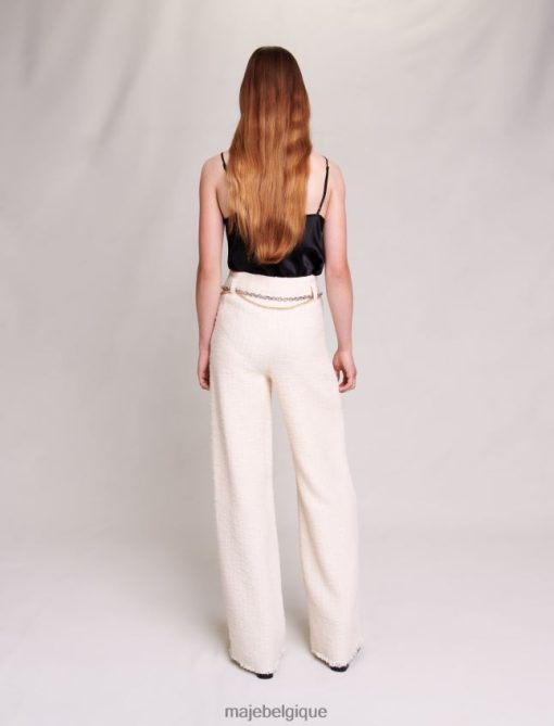 ce pantalon large taille haute en tweed écru apportera instantanément du charme à votre look. il présente une fermeture zippée sur le côté et de larges passants de ceinture, ainsi que deux poches plaquées avec boutons gravés. la taille est accentuée par une ceinture argentée et dorée, ornée de maillons perlés et d’une breloque trèfle pour un look intensément chic. À porter de jour comme de nuit, associé à un caraco, des bijoux, un sac signature et des sandales à plateforme.