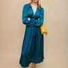 cette robe mi-longue est confectionnée dans une matière satinée confortable et douce. son décolleté en V est rehaussé de volants sur les épaules. il est resserré par des élastiques à la taille et aux poignets. parfait pour une occasion spéciale.