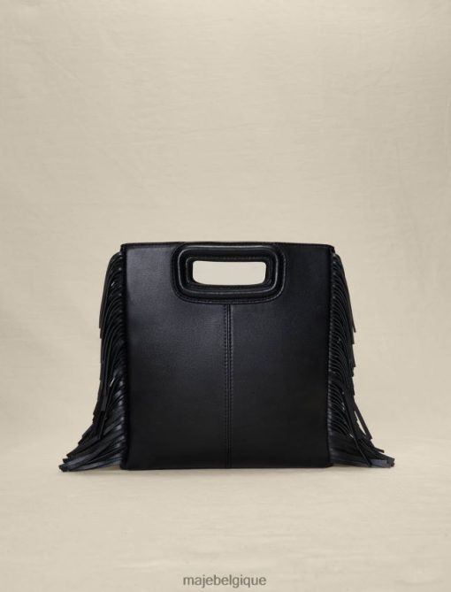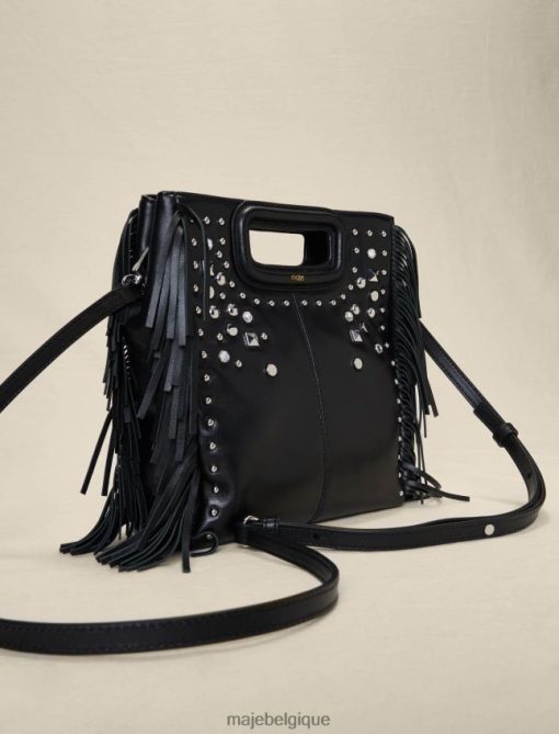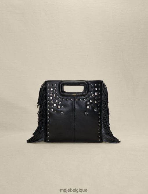 cette saison, le sac m iconique de Maje se décline dans une version noire cloutée. agrémenté de franges sur les côtés et doté d’une anse gainée, il présente un logo doré embossé et une signature gravée sur les mousquetons. en plus de sa pratique fermeture aimantée, il possède une bandoulière réglable et amovible vous permettant de le porter de différentes manières : à la main, en bandoulière ou en bandoulière.